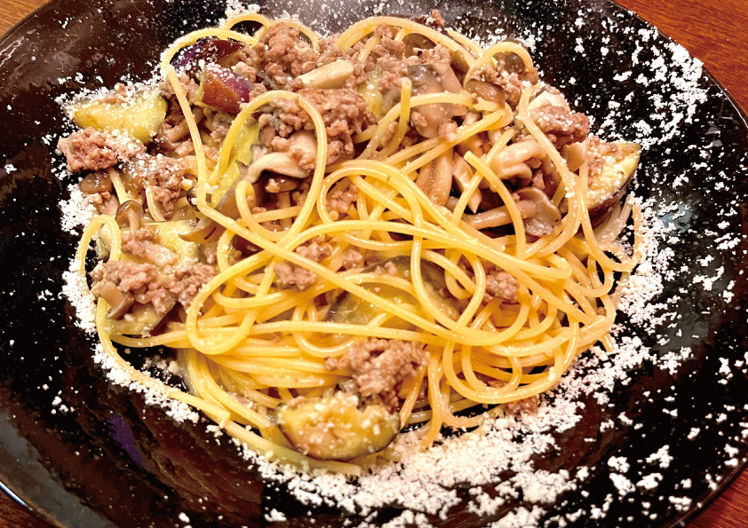合い挽き肉を煮込んだラグーソースに茄子をトッピング!生姜の香りが食欲をひきたてます♪